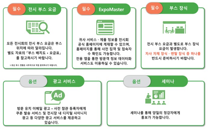 -부스비 : JPY 1,200,000 / 16.2sqm 기준 -Expo Master(웹포털 게재, 전용 앱 사용) : JPY 50,000 / 회사 기준 -장치비 : JPY 580,000 / 디자인 유형 -소비세 10% : JPY 183,000 조립부스(약 2부스/16.2sqm) 기준 총액 : JPY 2,013,000(약 18,948,973원)