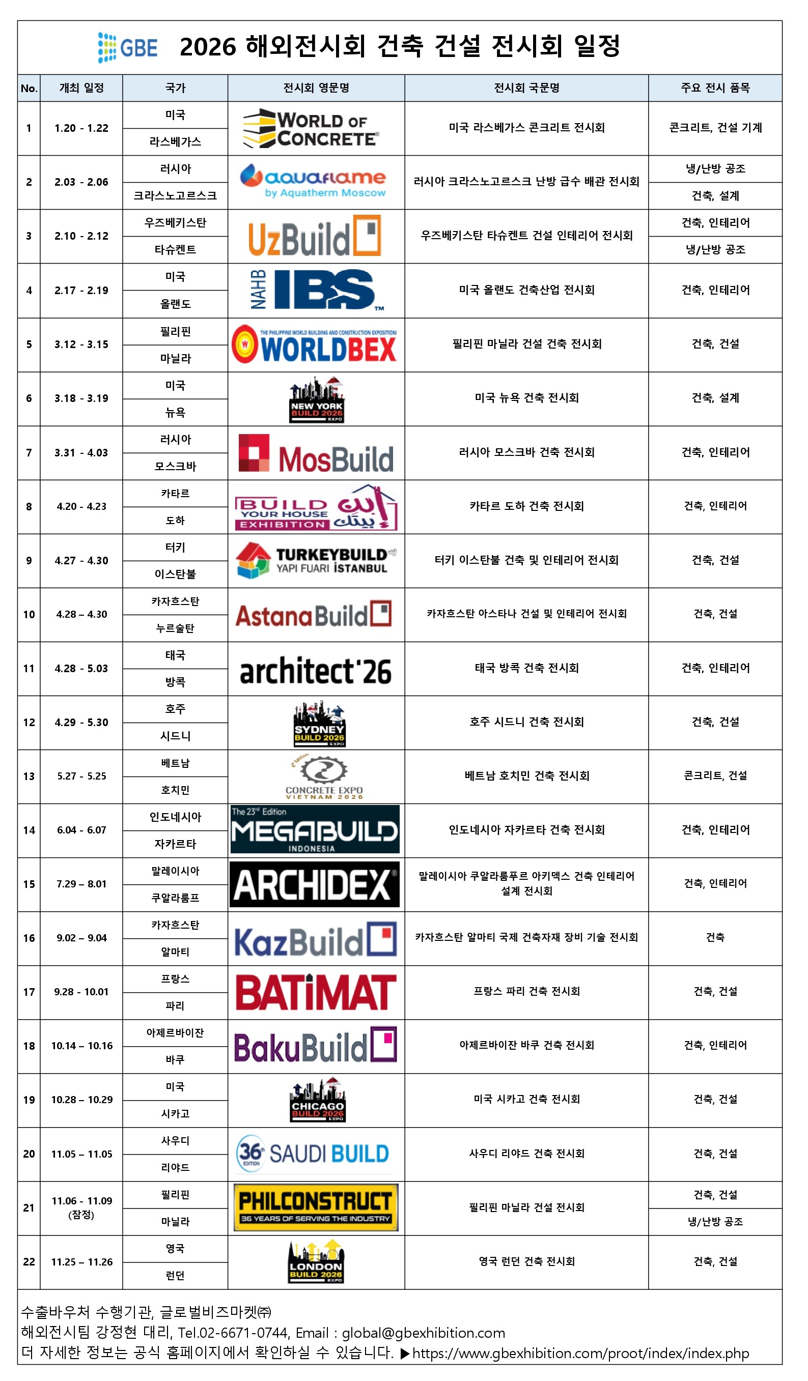 저희 GBE에서는 2026년 해외 건축 건설 인테리어 전시회의 전체 일정을 안내해드리오니 꼭 확인해주시기 바랍니다.